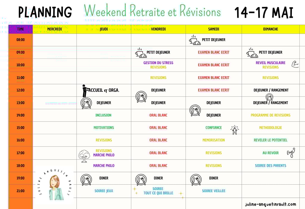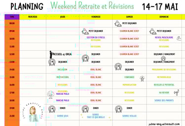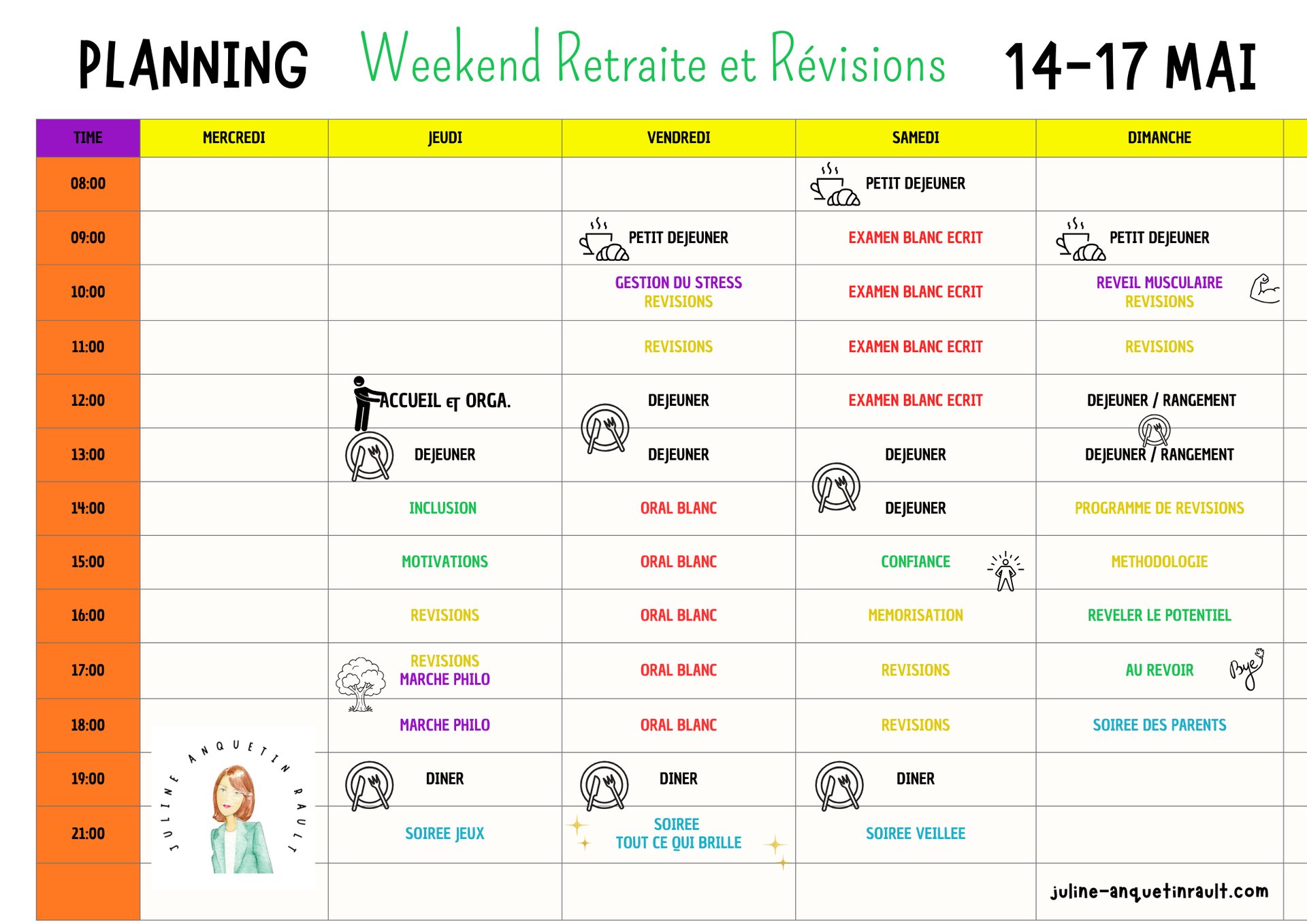 Partir un long weekend dans une maison de campagne en Normandie pour se mettre au vert, réviser, apprendre à gérer le stress, faire des balades philo, des oraux blancs, comprendre ses motivations et ses personnalités, travailler la méthodologie et l'estime de soi ...